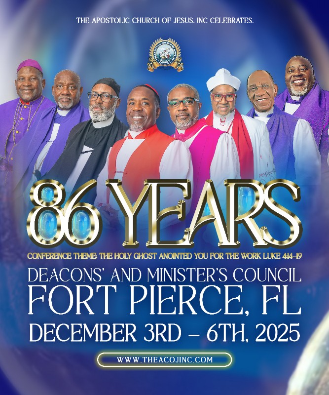The Apostolic Church of Jesus, Inc. proudly celebrates 86 powerful years of ministry! Join us for the 2025 Deacons’ and Ministers’ Council in Fort Pierce, Florida, December 3rd�"6th. This year’s conference theme, "The Holy Ghost anointed you for the work" (Luke 4:44-19), reminds us that we are called, equipped, and empowered to serve. Come experience dynamic teaching, anointed preaching, and Holy Ghost-filled fellowship with church leaders and saints from across the nation. Don’t miss this milestone gathering as we honor our legacy and press forward in faith and power! 🙌